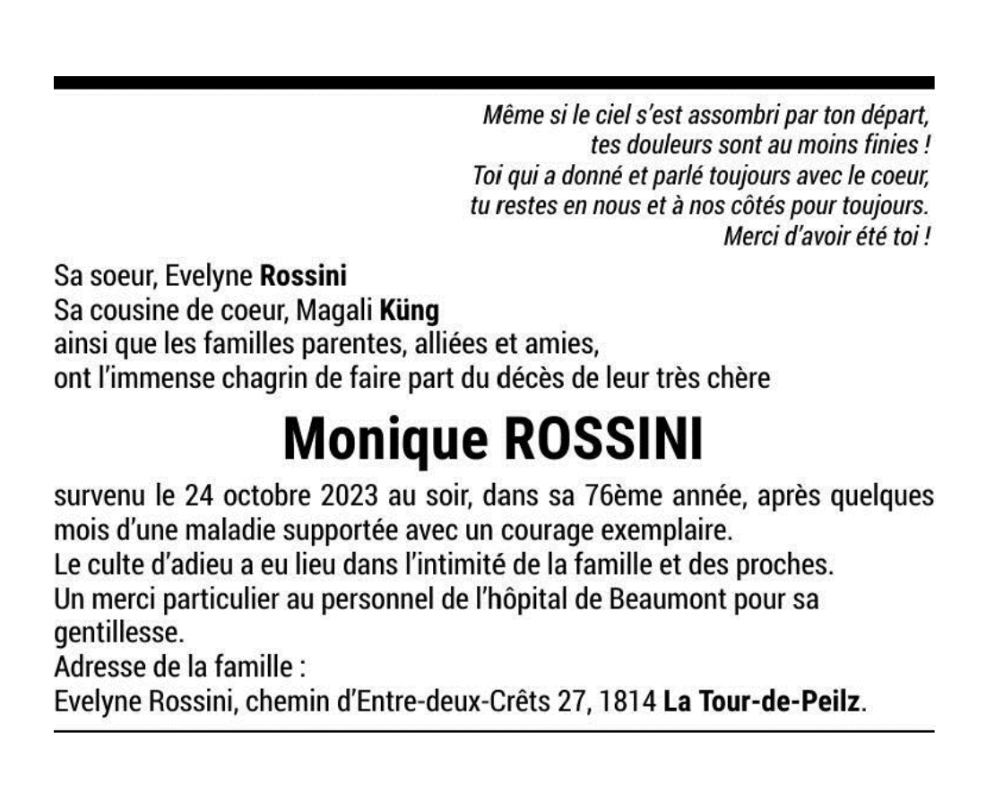 Monique ROSSINI 08 fév. 1948 - 24 oct. 2023 Avis mortuaire PFG Télecharger PDF Partager sur: Galerie PreviousNext PreviousNext