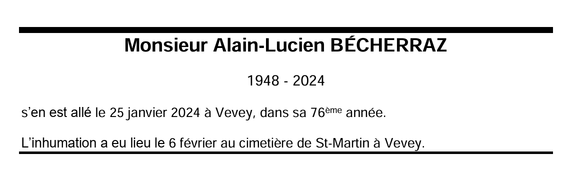Monsieur Alain-Lucien BÉCHERRAZ 12 mar. 1948 - 25 jan. 2024 Avis mortuaire PFG Télecharger PDF Partager sur: Galerie PreviousNext PreviousNext