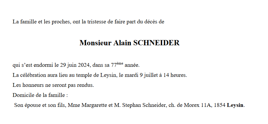 Monsieur Alain SCHNEIDER 12 sep. 1947 - 29 juin. 2024 Avis mortuaire PFG Télecharger PDF Partager sur: Galerie PreviousNext PreviousNext