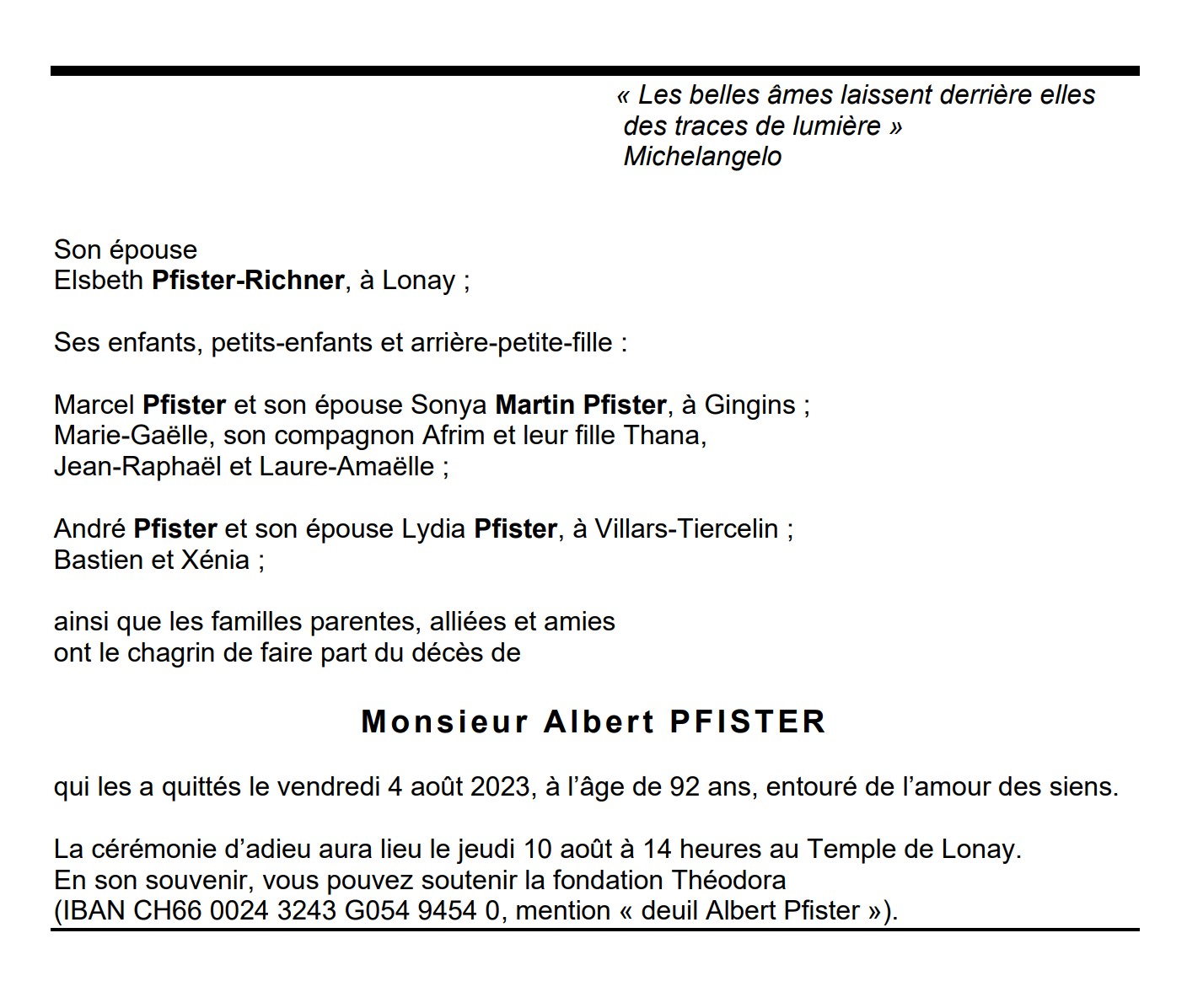 Monsieur Albert PFISTER 17 avr. 1931 - 04 aoû. 2023 Avis mortuaire PFG Télecharger PDF Partager sur: Galerie PreviousNext PreviousNext