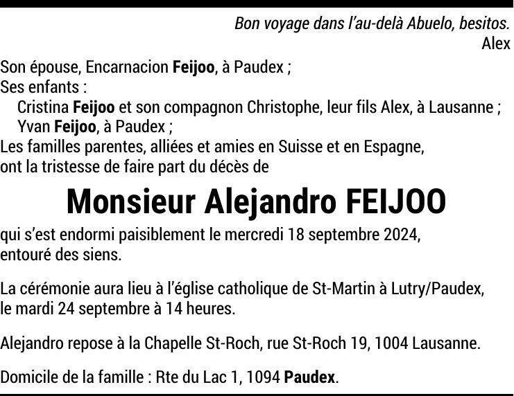 Monsieur Alejandro FEIJOO 10 juin. 1946 - 18 sep. 2024 Avis mortuaire PFG Partager sur: Galerie PreviousNext PreviousNext