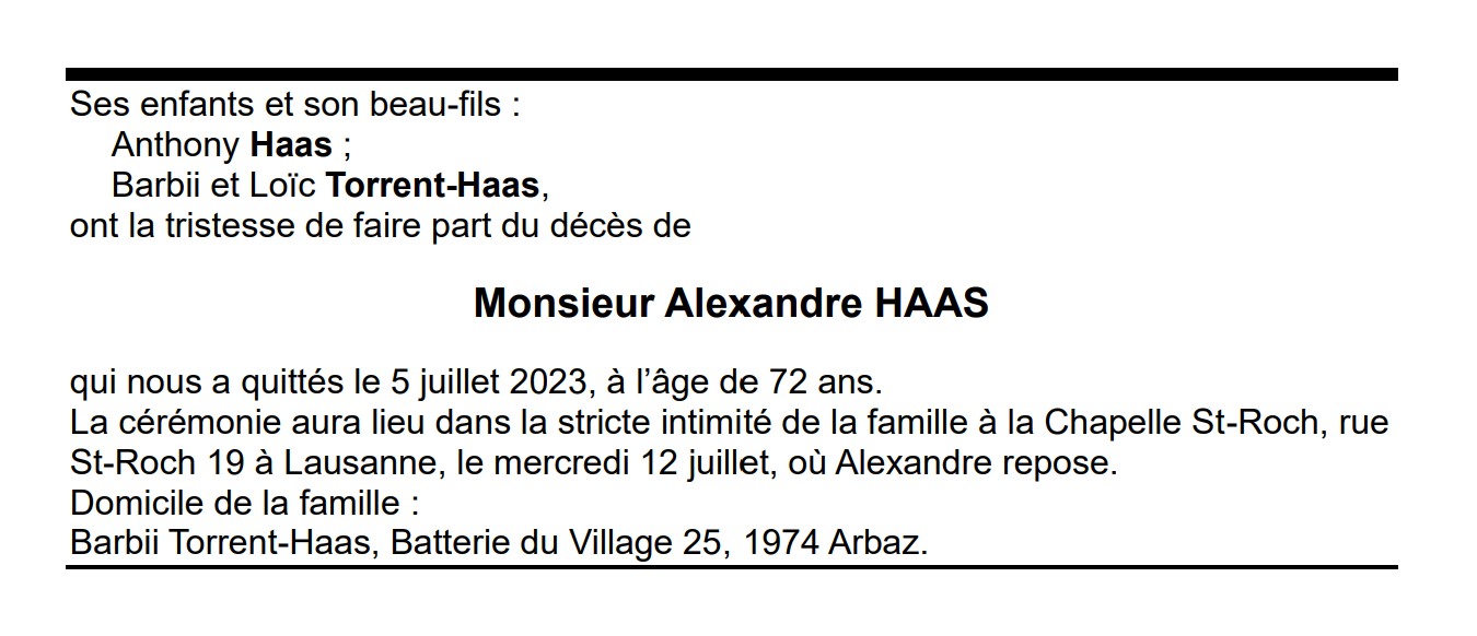 Monsieur Alexandre HAAS 28 avr. 1951 - 05 juil. 2023 Avis mortuaire PFG Télecharger PDF Partager sur: Galerie PreviousNext PreviousNext