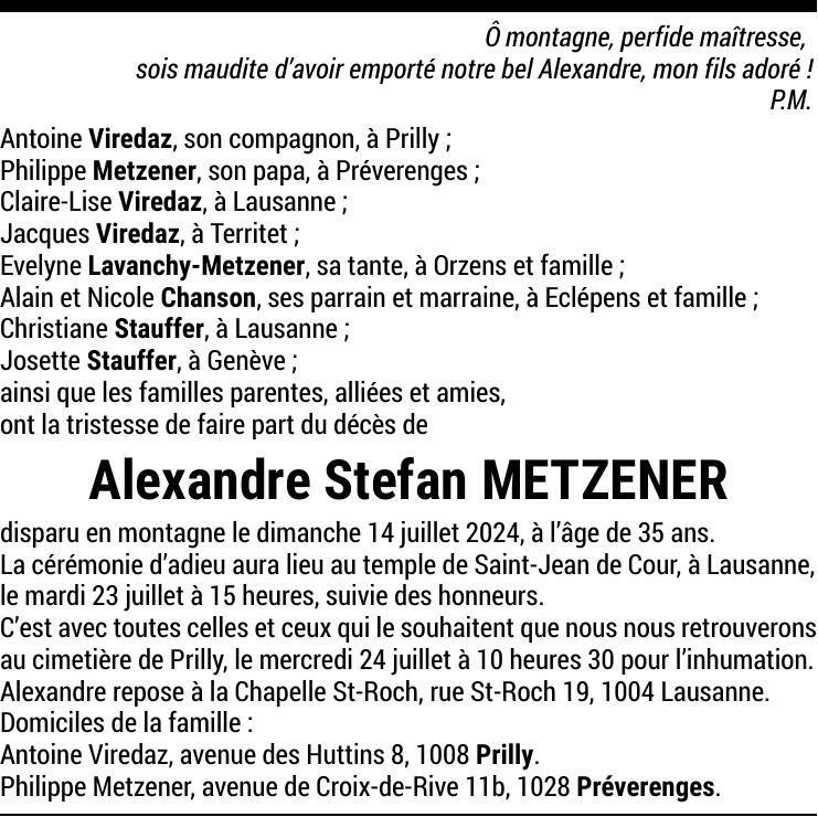 Monsieur Alexandre Stefan METZENER 17 jan. 1989 - 14 juil. 2024 Avis mortuaire PFG Partager sur: Galerie PreviousNext PreviousNext