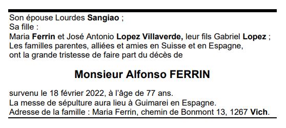 Monsieur Alfonso FERRIN 04 fév. 1945 - 18 fév. 2022 Avis mortuaire PFG Télecharger PDF Partager sur: Galerie PreviousNext PreviousNext