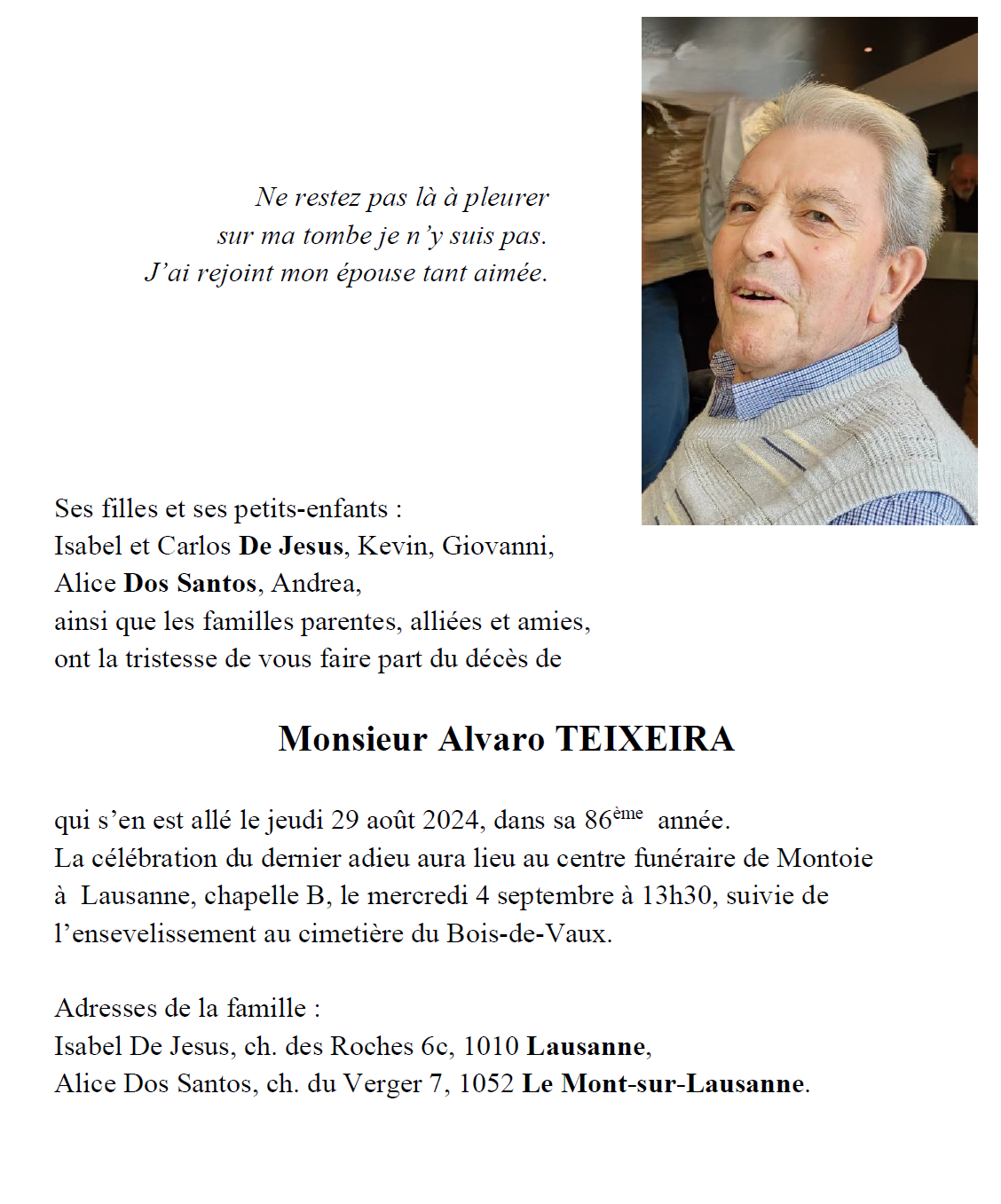 Monsieur Alvaro TEIXEIRA 24 jan. 1938 - 29 aoû. 2024 Avis mortuaire PFG Télecharger PDF Partager sur: Galerie