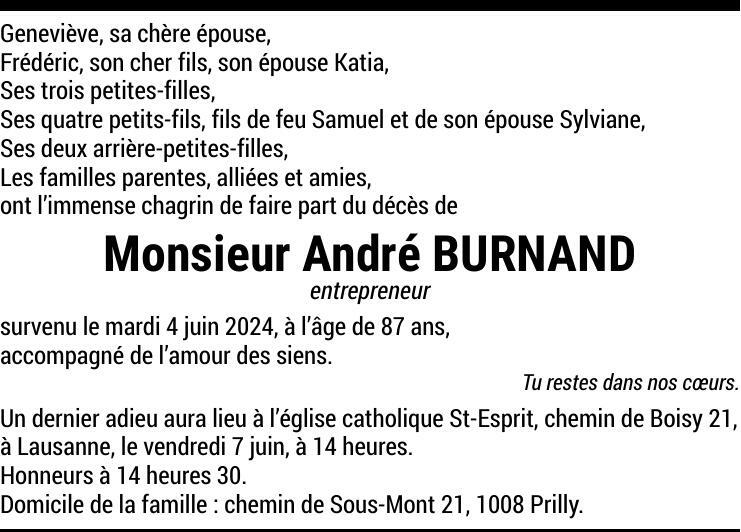 Monsieur André BURNAND 25 jan. 1937 - 04 juin. 2024 Avis mortuaire PFG Partager sur: Galerie PreviousNext PreviousNext
