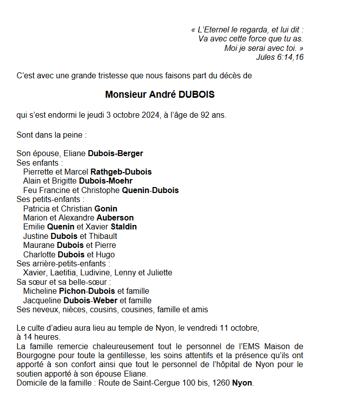 Monsieur André DUBOIS 17 sep. 1932 - 03 oct. 2024 Avis mortuaire PFG Télecharger PDF Partager sur: Galerie PreviousNext PreviousNext