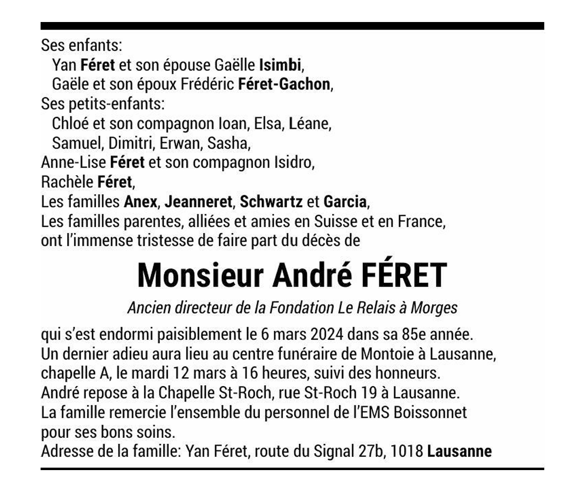 Monsieur André FÉRET 22 sep. 1939 - 06 mar. 2024 Avis mortuaire PFG Télecharger PDF Partager sur: Galerie PreviousNext PreviousNext