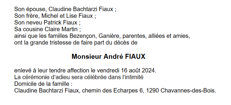 Monsieur André FIAUX 20 nov. 1946 - 16 aoû. 2024 Avis mortuaire PFG Télecharger PDF Partager sur: Galerie