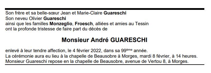 Monsieur André GUARESCHI 17 déc. 1923 - 04 fév. 2022 Avis mortuaire PFG Télecharger PDF Partager sur: Galerie PreviousNext PreviousNext