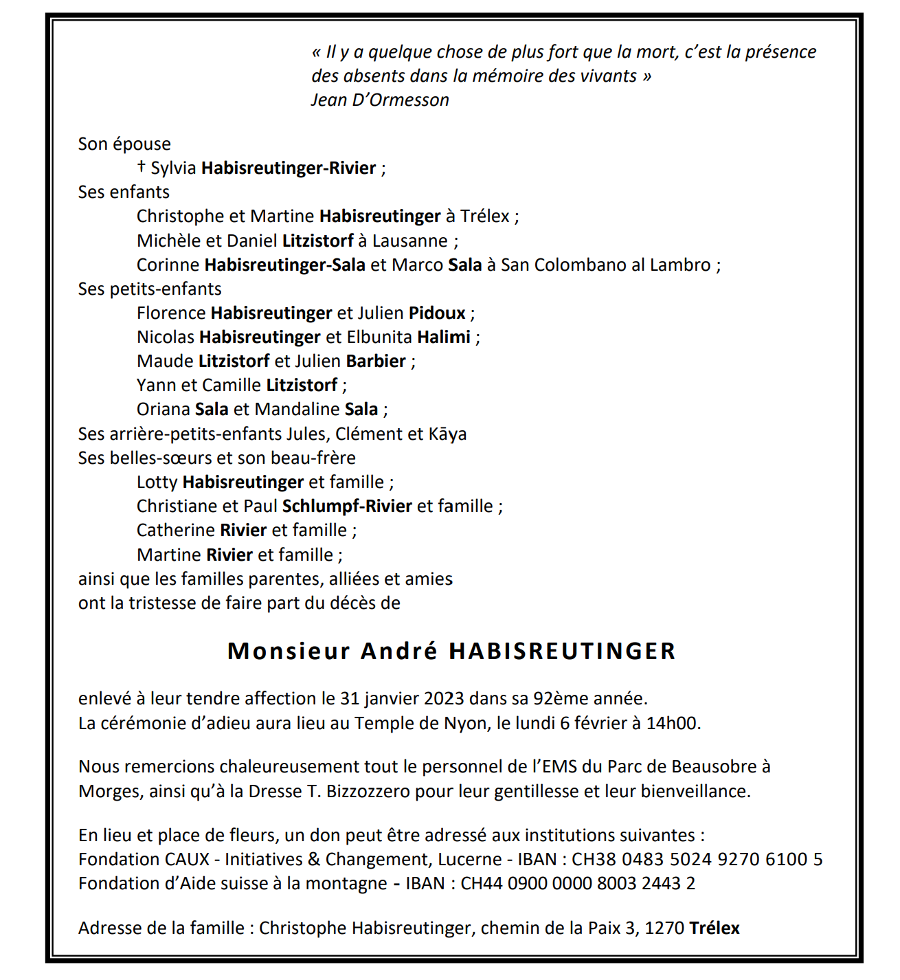 Monsieur André HABISREUTINGER 07 mai. 1931 - 31 jan. 2023 Avis mortuaire PFG Télecharger PDF Partager sur: Galerie PreviousNext PreviousNext