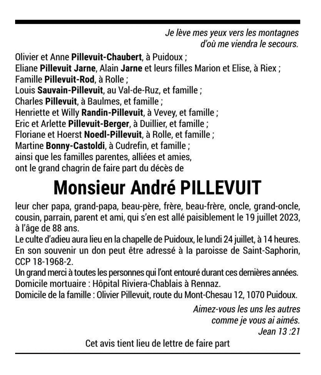 Monsieur André PILLEVUIT 20 fév. 1935 - 19 juil. 2023 Avis mortuaire PFG Télecharger PDF Partager sur: Galerie