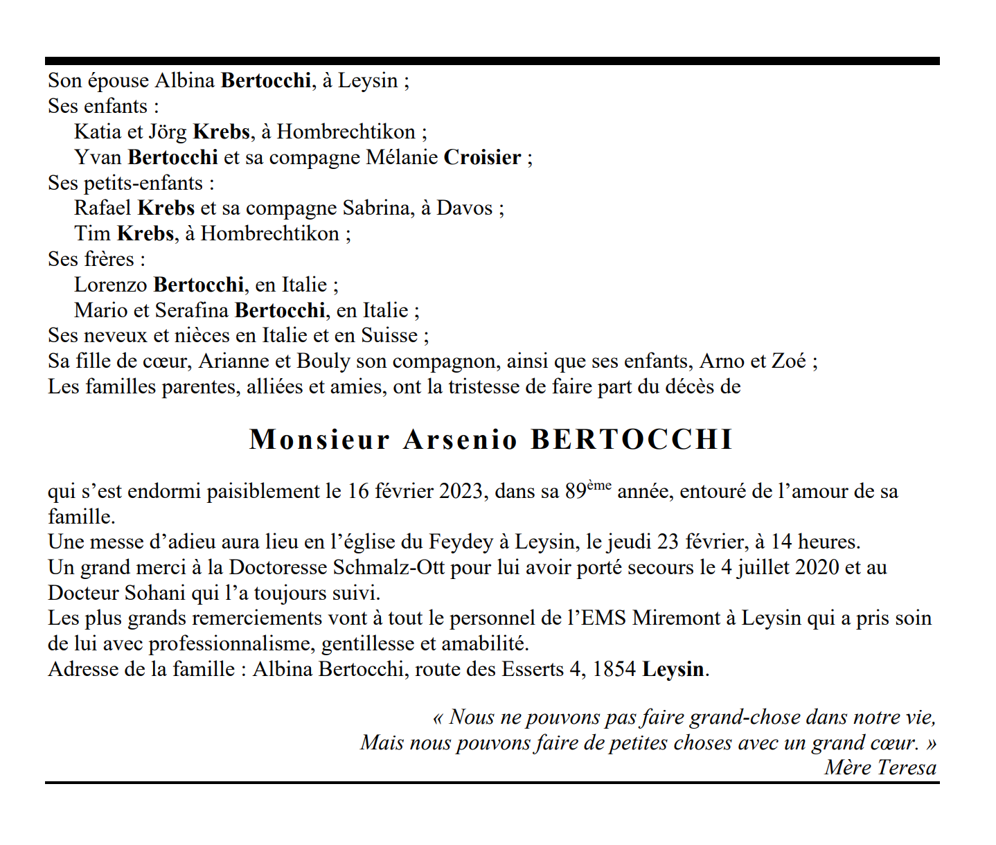Monsieur Arsenio BERTOCCHI 16 sep. 1934 - 16 fév. 2023 Avis mortuaire PFG Télecharger PDF Partager sur: Galerie PreviousNext PreviousNext