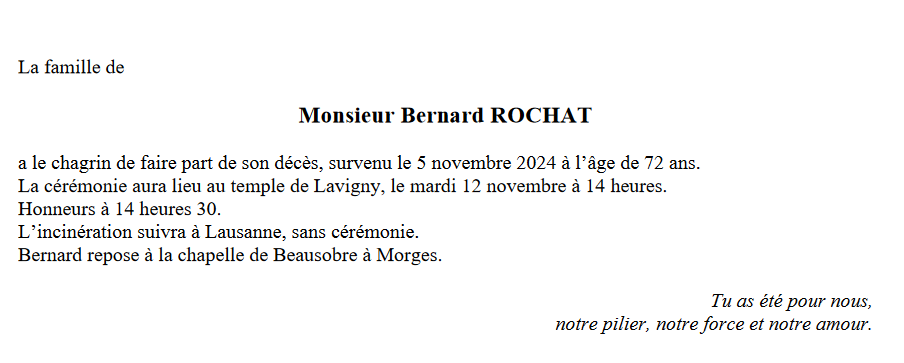 Monsieur Bernard ROCHAT 27 oct. 1952 - 05 nov. 2024 Avis mortuaire PFG Télecharger PDF Partager sur: Galerie PreviousNext PreviousNext