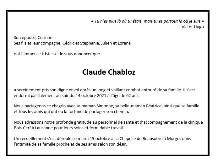 Monsieur Claude Chabloz 30 juil. 1959 - 14 oct. 2021 Avis mortuaire PFG Télecharger PDF Partager sur: Galerie PreviousNext PreviousNext