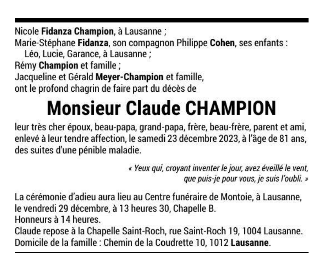 Monsieur Claude CHAMPION 22 mai. 1942 - 23 déc. 2023 Avis mortuaire PFG Télecharger PDF Partager sur: Galerie PreviousNext PreviousNext