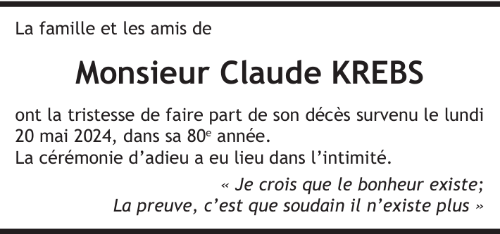 Monsieur Claude KREBS 19 déc. 1944 - 20 mai. 2024 Avis mortuaire PFG Télecharger PDF Partager sur: Galerie PreviousNext PreviousNext