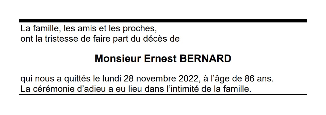 Monsieur Ernest BERNARD 23 mar. 1936 - 28 nov. 2022 Avis mortuaire PFG Télecharger PDF Partager sur: Galerie