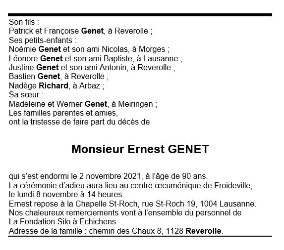 Monsieur Ernest Genet 07 déc. 1930 - 02 nov. 2021 Avis mortuaire PFG Télecharger PDF Partager sur: Galerie PreviousNext PreviousNext