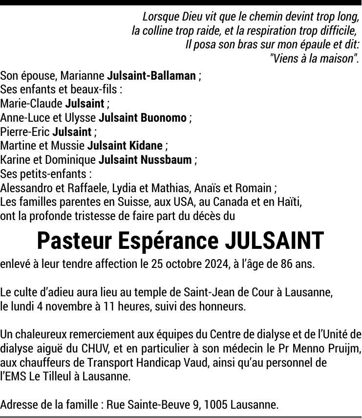 Monsieur Espérance JULSAINT 03 oct. 1938 - 26 oct. 2024 Avis mortuaire PFG Partager sur: Galerie PreviousNext PreviousNext