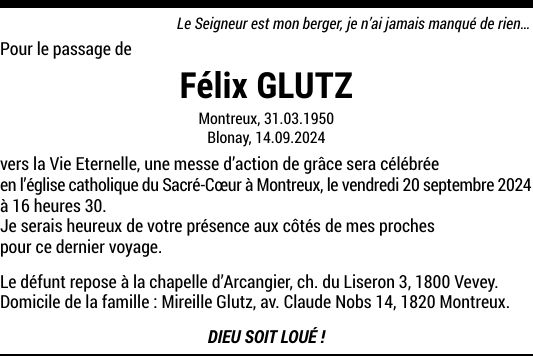 Monsieur Félix GLUTZ 31 mar. 1950 - 14 sep. 2024 Avis mortuaire PFG Partager sur: Galerie PreviousNext PreviousNext