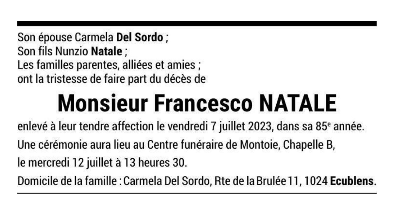 Monsieur Francesco NATALE 15 sep. 1938 - 07 juil. 2023 Avis mortuaire PFG Télecharger PDF Partager sur: Galerie PreviousNext PreviousNext