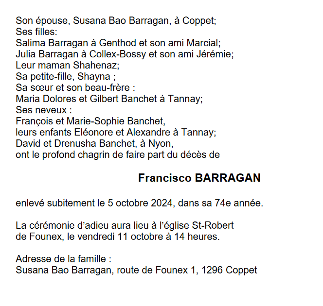 Monsieur Francisco BARRAGAN 11 nov. 1950 - 05 oct. 2024 Avis mortuaire PFG Télecharger PDF Partager sur: Galerie
