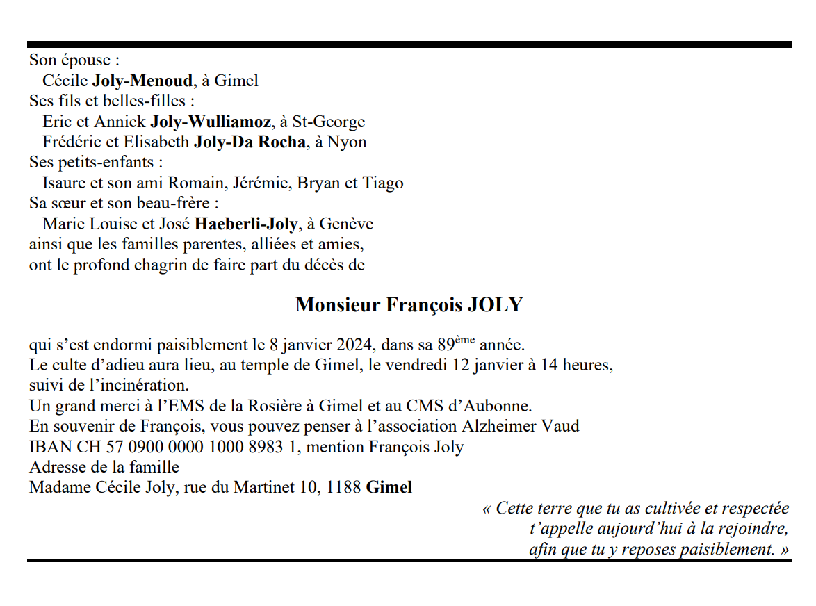 Monsieur François JOLY 24 sep. 1935 - 08 jan. 2024 Avis mortuaire PFG Télecharger PDF Partager sur: Galerie PreviousNext PreviousNext