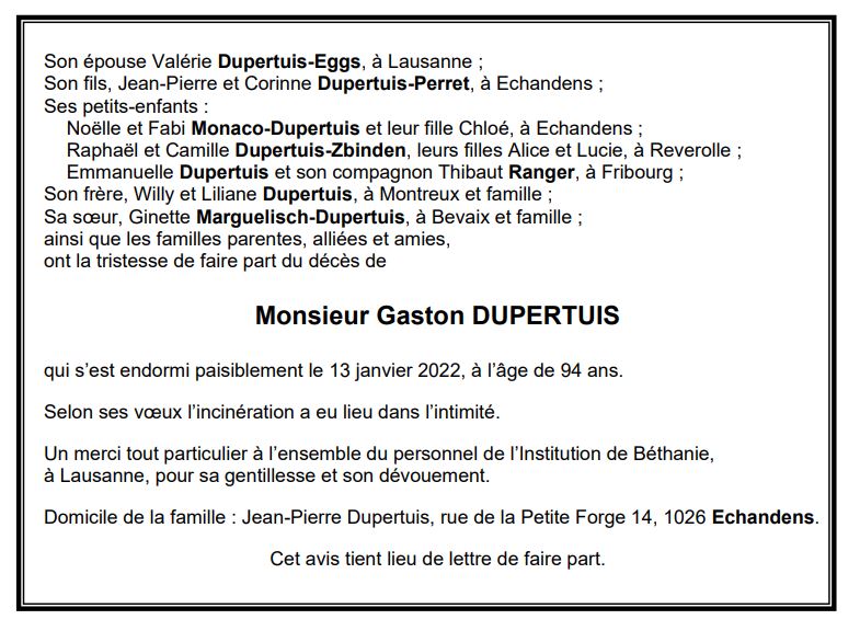 Monsieur Gaston DUPERTUIS 31 aoû. 1927 - 13 jan. 2022 Avis mortuaire PFG Télecharger PDF Partager sur: Galerie PreviousNext PreviousNext