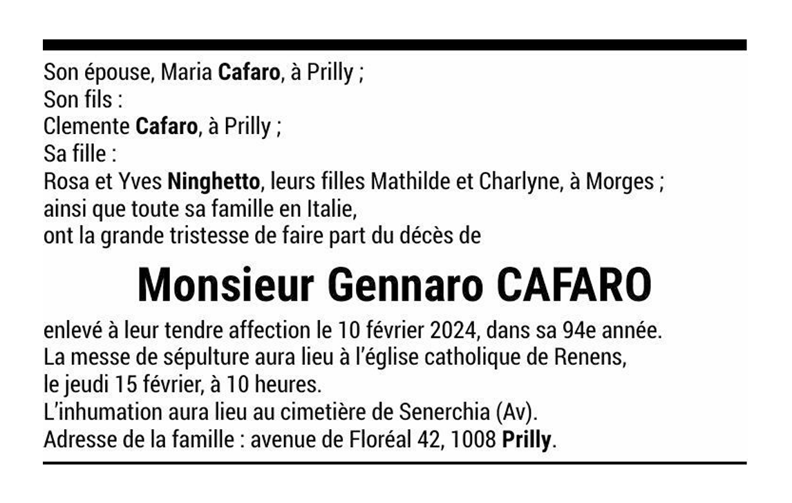 Monsieur Gennaro CAFARO 28 nov. 1949 - 10 fév. 2024 Avis mortuaire PFG Télecharger PDF Partager sur: Galerie PreviousNext PreviousNext