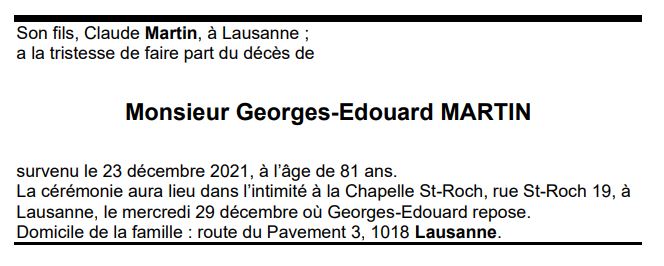 Monsieur Georges-Edouard MARTIN 02 mar. 1940 - 23 déc. 2021 Avis mortuaire PFG Télecharger PDF Partager sur: Galerie PreviousNext PreviousNext