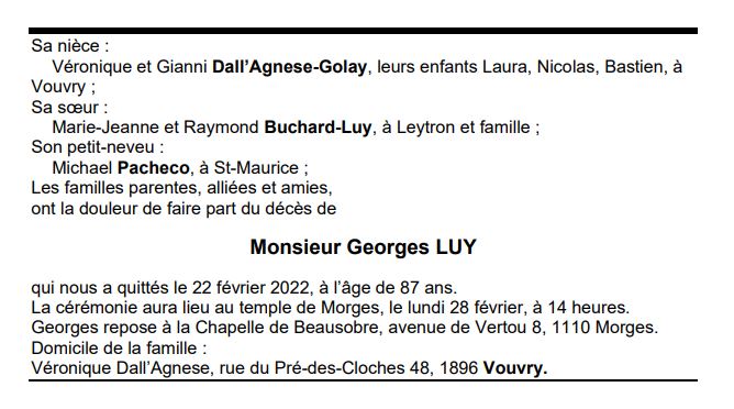 Monsieur Georges LUY 14 jan. 1935 - 22 fév. 2022 Avis mortuaire PFG Télecharger PDF Partager sur: Galerie PreviousNext PreviousNext