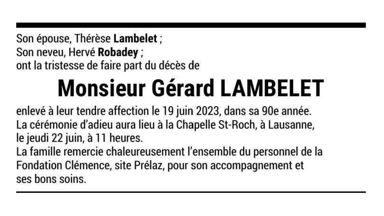 Monsieur Gérard LAMBELET 17 déc. 1933 - 19 juin. 2023 Avis mortuaire PFG Télecharger PDF Partager sur: Galerie PreviousNext PreviousNext