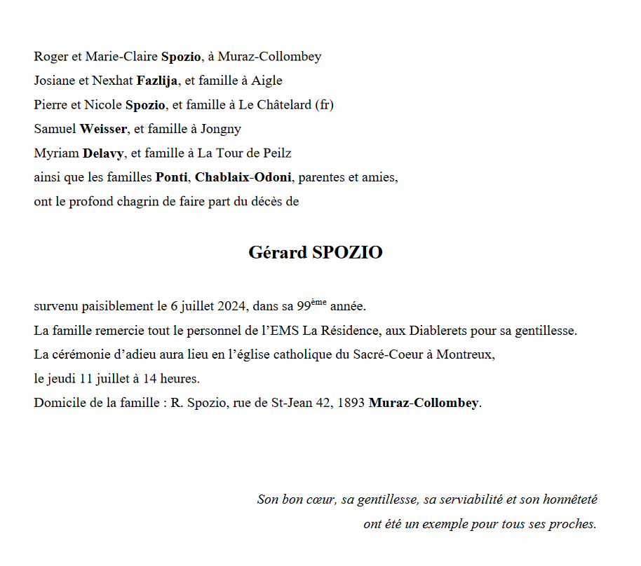 Monsieur Gérard SPOZIO 29 oct. 1925 - 06 juil. 2024 Avis mortuaire PFG Télecharger PDF Partager sur: Galerie PreviousNext PreviousNext
