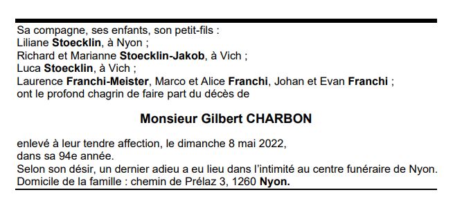 Monsieur Gilbert CHARBON 14 aoû. 1928 - 08 mai. 2022 Avis mortuaire PFG Télecharger PDF Partager sur: Galerie PreviousNext PreviousNext