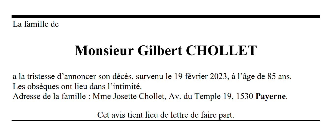 Monsieur Gilbert CHOLLET 10 nov. 1937 - 19 fév. 2023 Avis mortuaire PFG Télecharger PDF Partager sur: Galerie