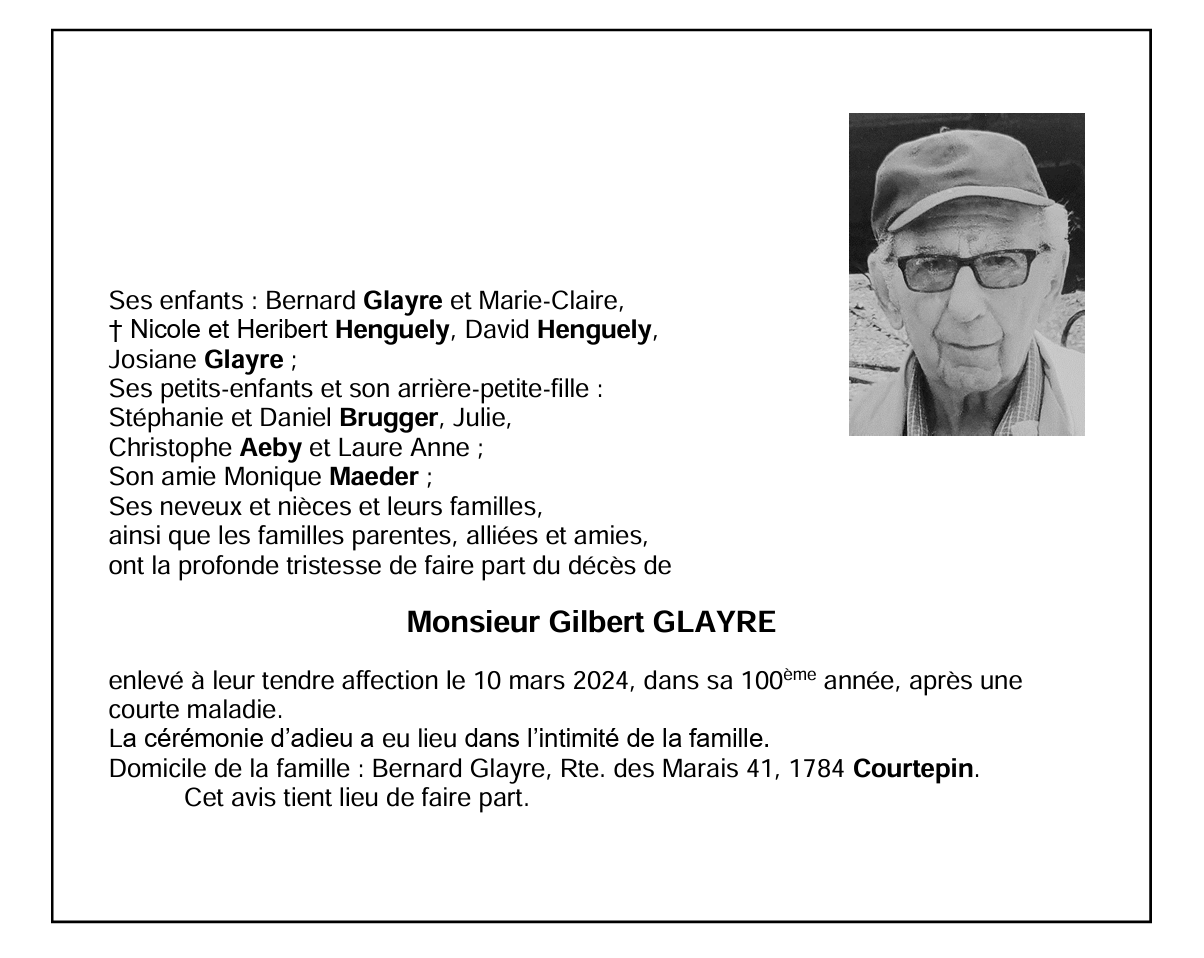 Monsieur Gilbert GLAYRE 05 déc. 1924 - 10 mar. 2024 Avis mortuaire PFG Télecharger PDF Partager sur: Galerie