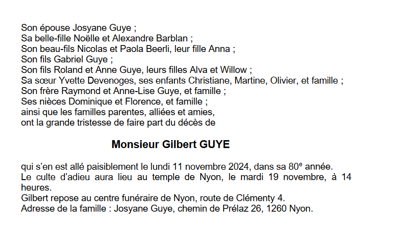 Monsieur Gilbert GUYE 05 fév. 1945 - 11 nov. 2024 Avis mortuaire PFG Télecharger PDF Partager sur: Galerie PreviousNext PreviousNext