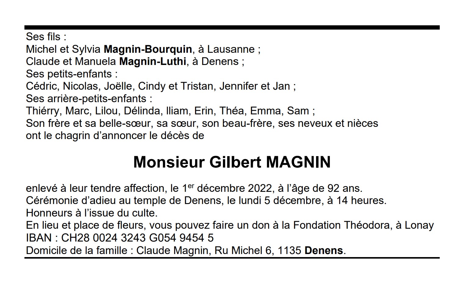 Monsieur Gilbert MAGNIN 23 nov. 1930 - 01 déc. 2022 Avis mortuaire PFG Télecharger PDF Partager sur: Galerie PreviousNext PreviousNext