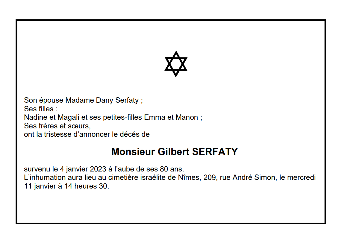 Monsieur Gilbert SERFATY 09 avr. 1943 - 04 jan. 2023 Avis mortuaire PFG Télecharger PDF Partager sur: Galerie
