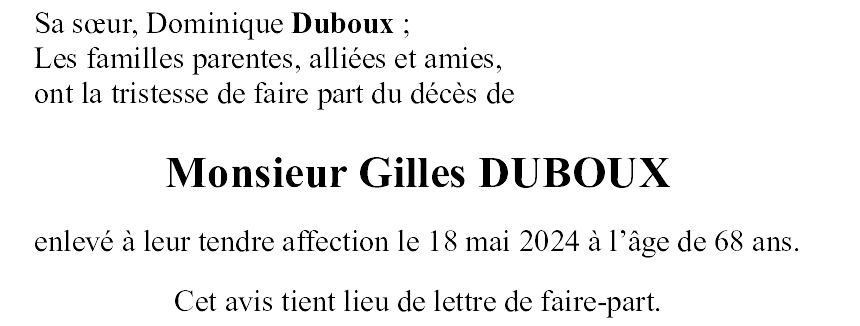 Monsieur Gilles DUBOUX 27 avr. 1956 - 18 mai. 2024 Avis mortuaire PFG Partager sur: Galerie PreviousNext PreviousNext