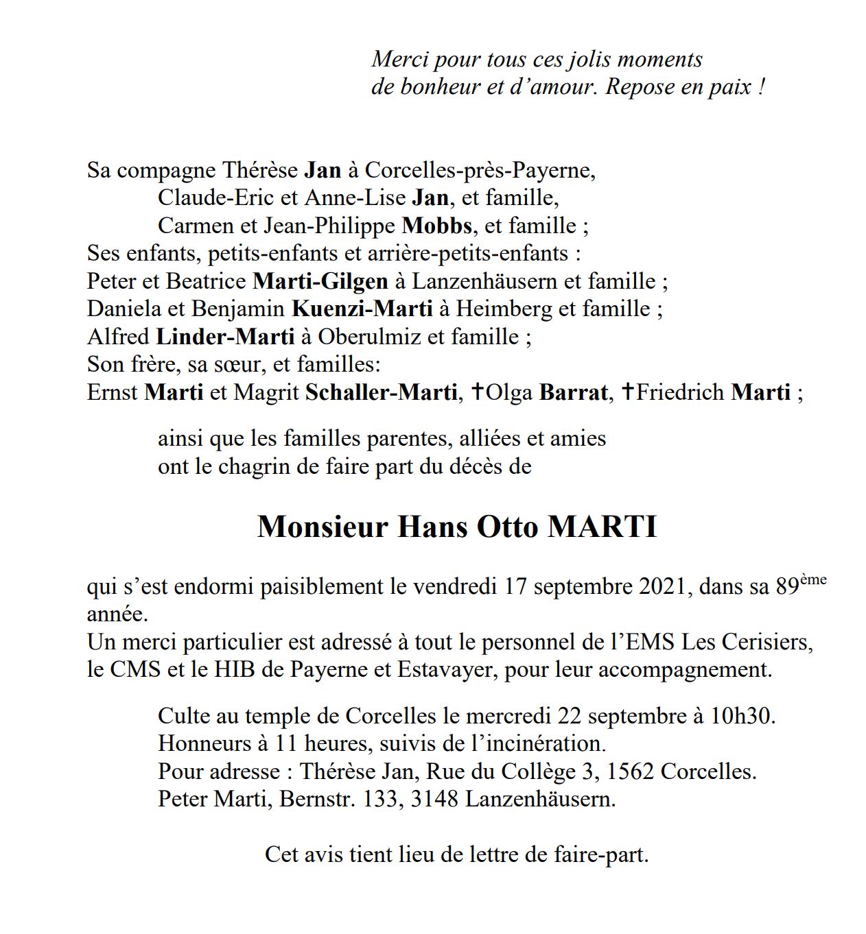 Monsieur Hans Otto MARTI 03 nov. 1932 - 17 sep. 2021 Avis mortuaire PFG Télecharger PDF Partager sur: Galerie PreviousNext PreviousNext