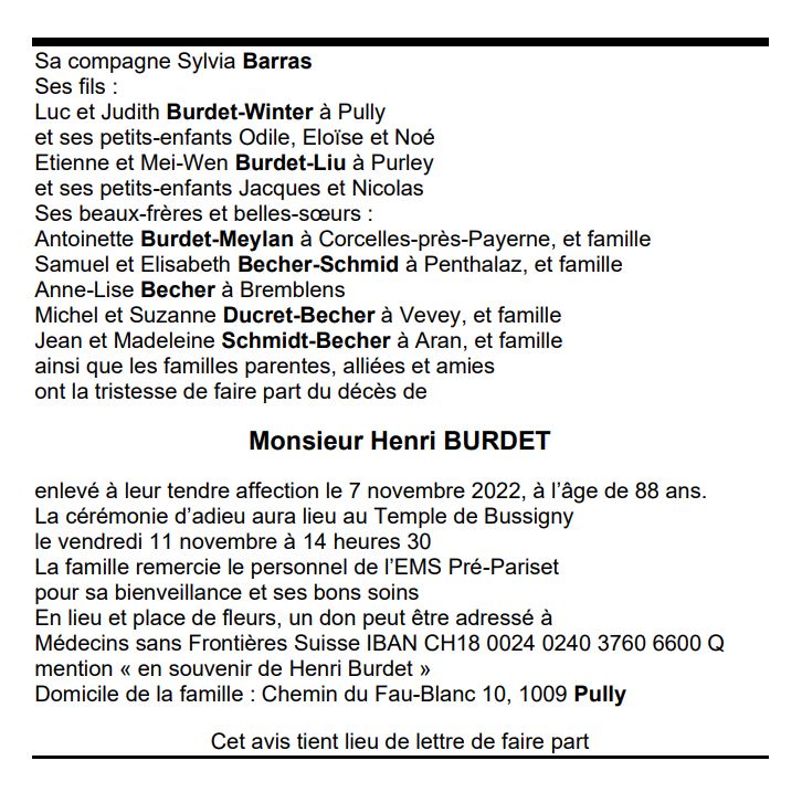 Monsieur Henri BURDET 21 sep. 1934 - 07 nov. 2022 Avis mortuaire PFG Télecharger PDF Partager sur: Galerie PreviousNext PreviousNext