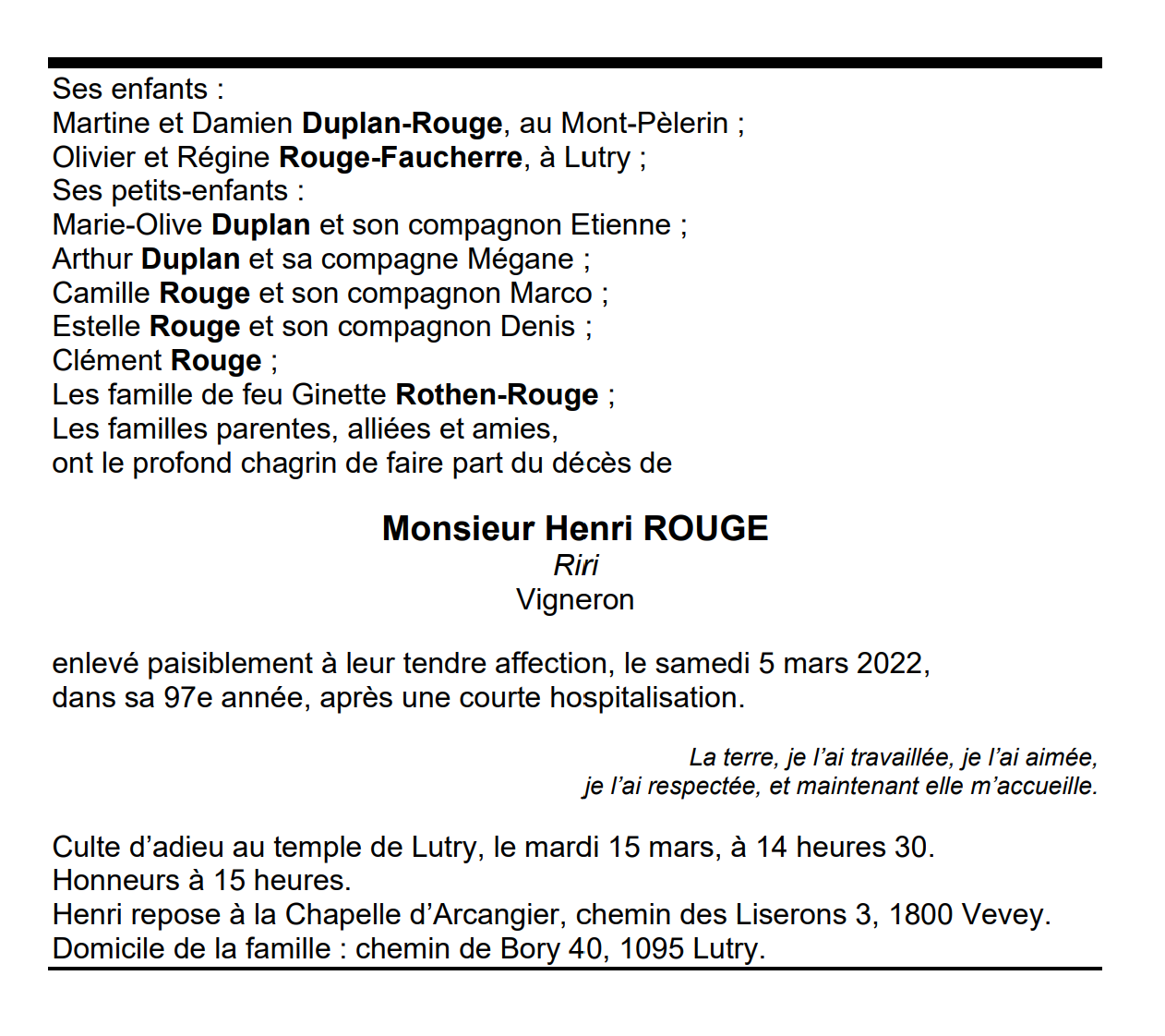 Monsieur Henri ROUGE 05 oct. 1925 - 05 mar. 2022 Avis mortuaire PFG Télecharger PDF Partager sur: Galerie PreviousNext PreviousNext