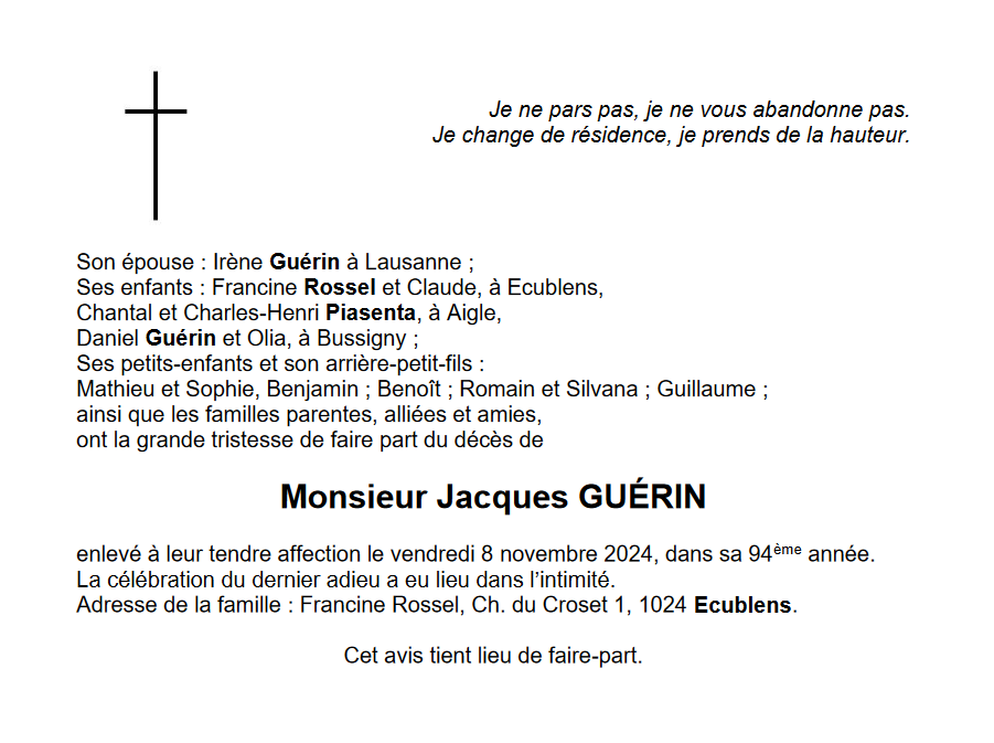 Monsieur Jacques GUÉRIN 17 aoû. 1931 - 08 nov. 2024 Avis mortuaire PFG Télecharger PDF Partager sur: Galerie