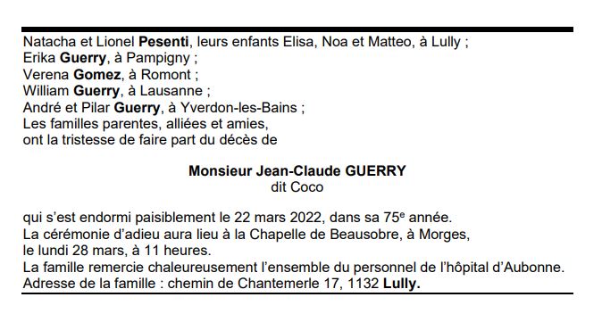 Monsieur Jean-Claude GUERRY 21 juil. 1947 - 22 mar. 2022 Avis mortuaire PFG Télecharger PDF Partager sur: Galerie PreviousNext PreviousNext