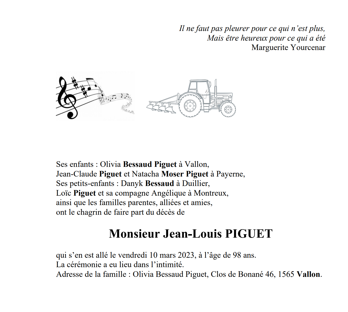 Monsieur Jean-Louis PIGUET 09 juil. 1924 - 10 mar. 2023 Avis mortuaire PFG Télecharger PDF Partager sur: Galerie