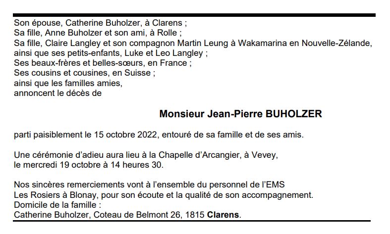 Monsieur Jean-Pierre BUHOLZER 23 jan. 1946 - 15 oct. 2022 Avis mortuaire PFG Télecharger PDF Partager sur: Galerie PreviousNext PreviousNext