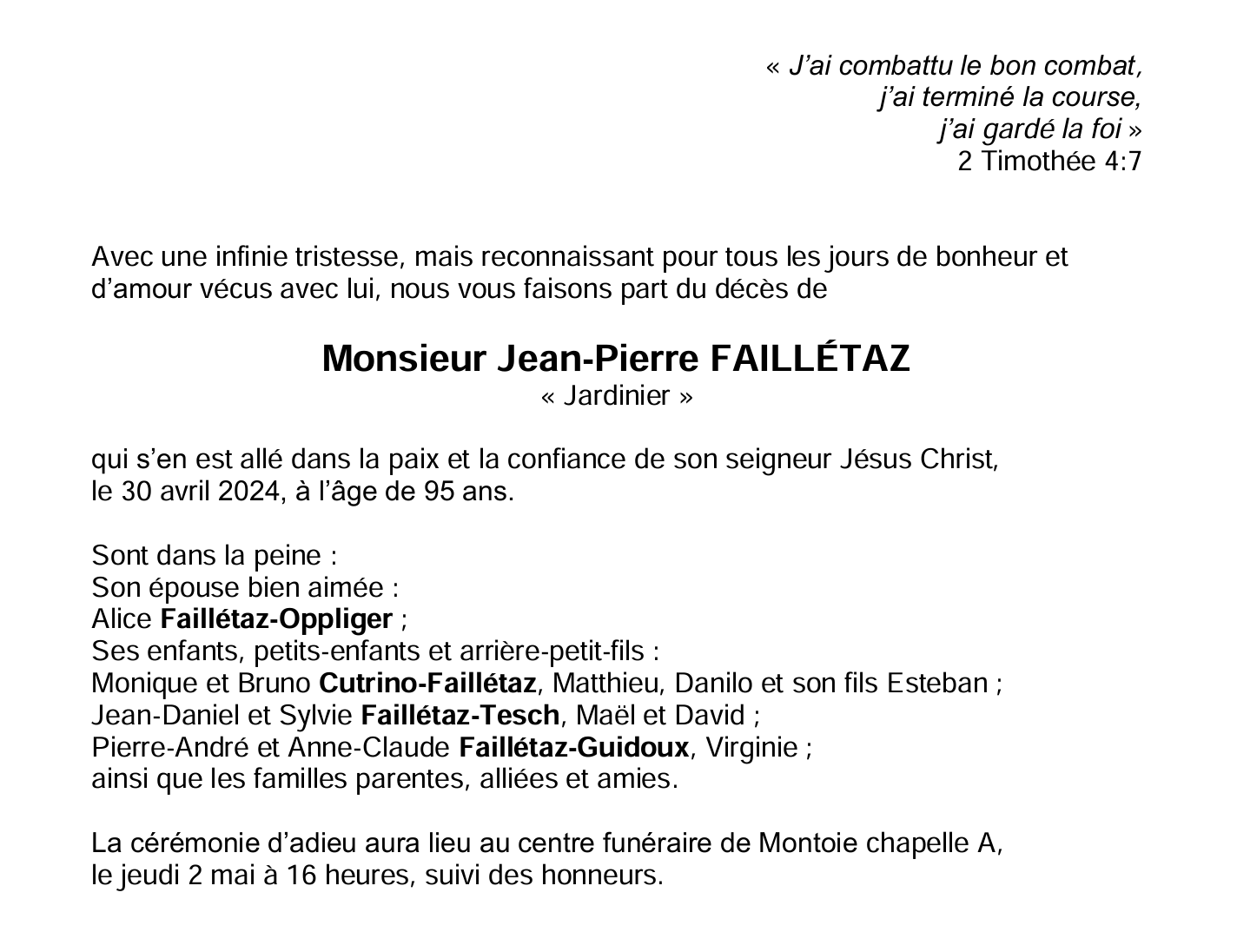 Monsieur Jean-Pierre FAILLÉTAZ 30 jan. 1929 - 30 avr. 2024 Avis mortuaire PFG Télecharger PDF Partager sur: Galerie