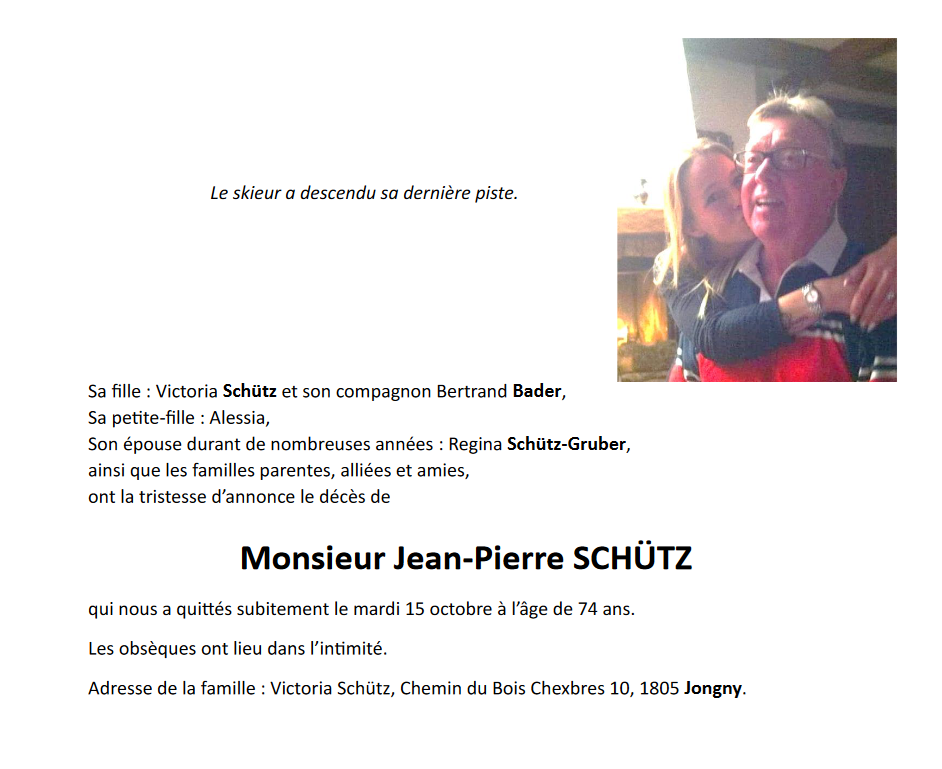 Monsieur Jean-Pierre SCHÜTZ 18 mar. 1950 - 15 oct. 2024 Avis mortuaire PFG Télecharger PDF Partager sur: Galerie